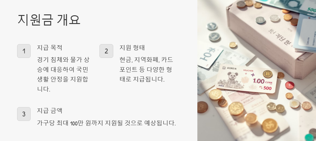 - 지원 형태: 현금 지급, 지역화폐, 카드 포인트 등 다양한 형태로 지급될 예정입니다.