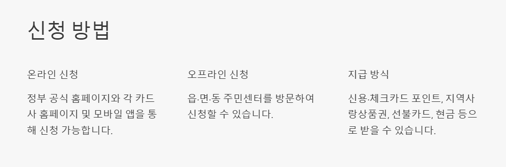 - 각 카드사 홈페이지 및 모바일 앱: 신용카드나 체크카드 포인트로 지급받기를 원하는 경우 해당 카드사의 온라인 플랫폼을 통해 신청할 수 있습니다.