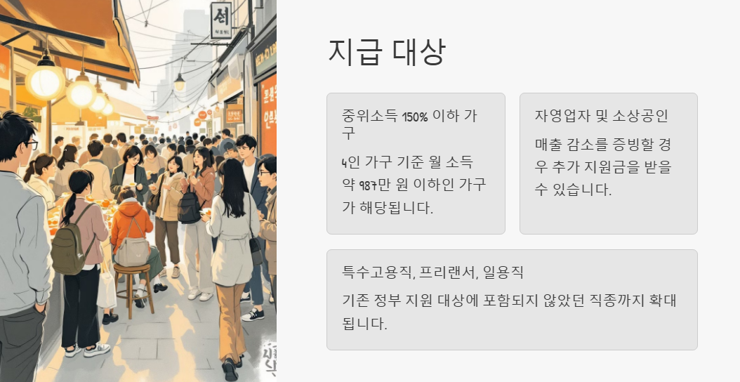 - 특수고용직, 프리랜서, 일용직 근로자: 기존 정부 지원 대상에 포함되지 않았던 직종까지 지원 범위가 확대될 예정입니다.