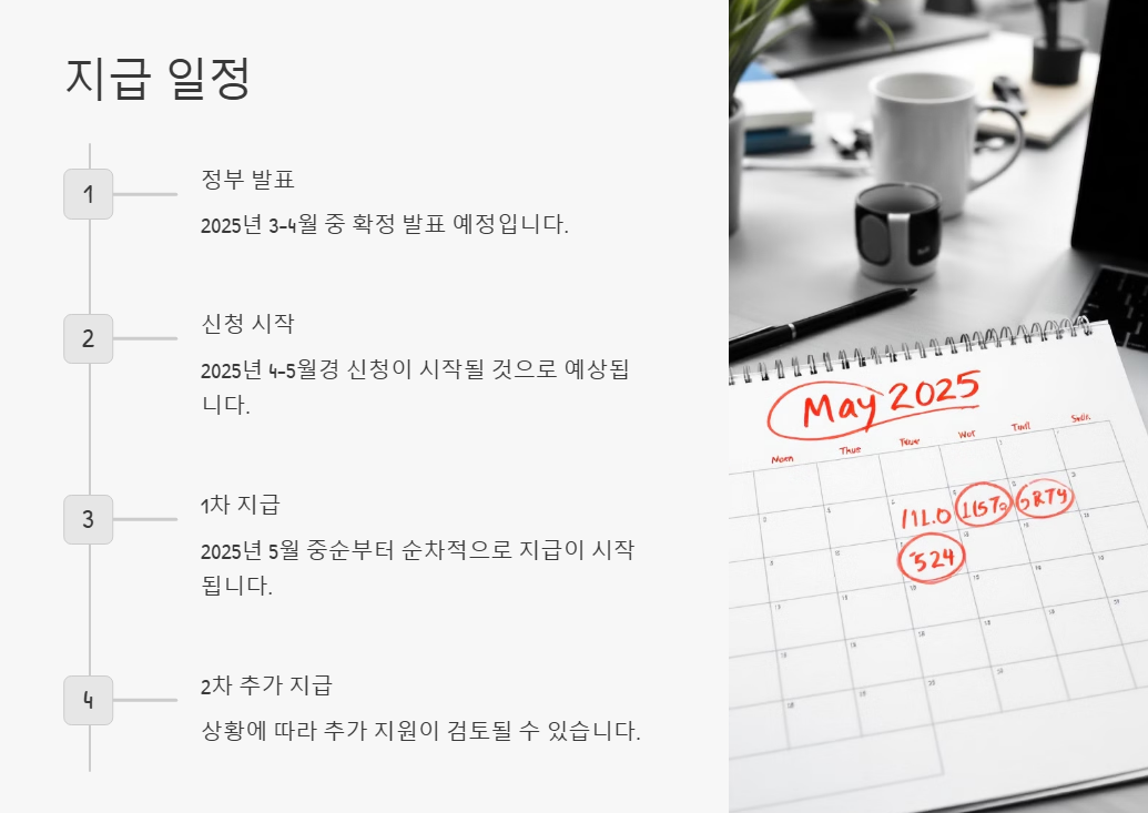 - 1차 지급: 2025년 5월 중순부터 순차적으로 지급이 시작될 예정입니다.